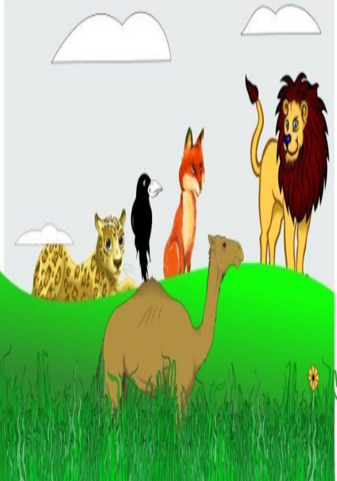 Therefore, the lion could not go out hunting. The other animals could not hunt, and they all went hungry. The lion is called the fox, the crow, and the camel.