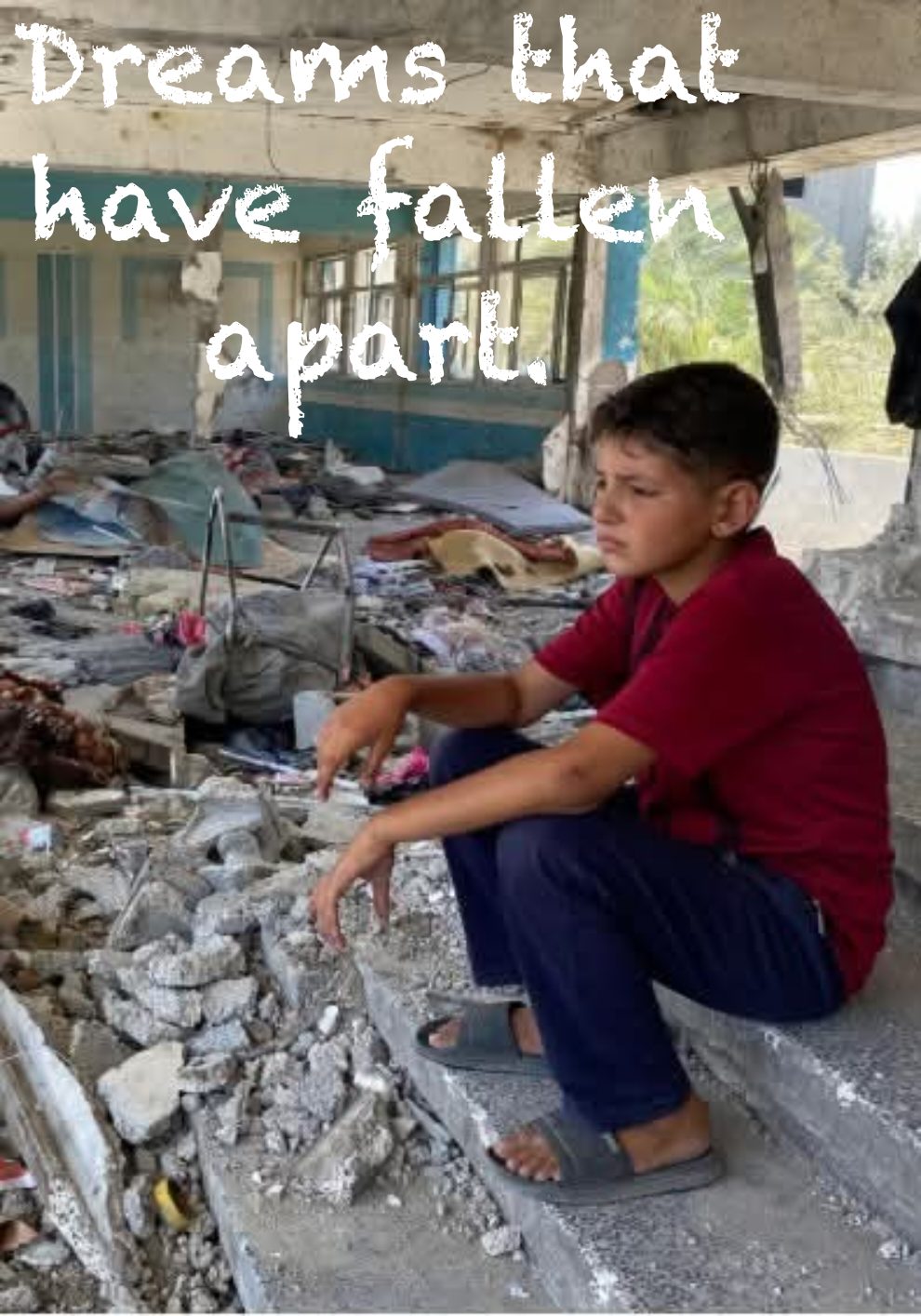 Sitting in the middle of the rubble from a destroyed school, this photo exemplifies dreams that have fallen apart.