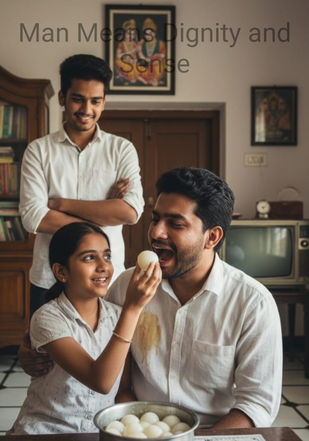 The moment he stepped inside, Bhargavi swiftly snatched the pot from his hand, tore off the paper covering, and quickly shoved an entire rasgulla into her mouth. The syrup dripped profusely from her hands and face. Placing the pot on a nearby table, she hugged Ravi with her sticky hands and began laughing incoherently. Ravi was already irritated, and Bhargavi’s behavior fueled his anger. He virtually pushed the girl seven feet away and yelled at his aunt: