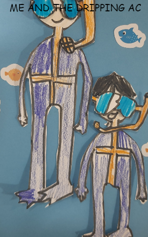 I made one paper boat and some paper people. When the bucket was full, I put paper people in the boat and pretended them sailing in the bucket sea. I then made up a story out of it.