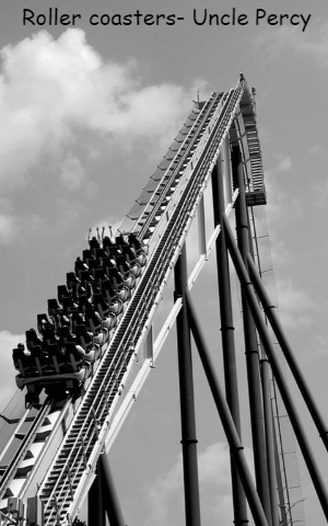 The roller coaster started slowly. Uncle was already shivering and holding onto the guard rail for dear life. I wonder who’s gonna tell him there’s a loop in here. Oh well, it's not gonna be me. I’m just as clueless as him!