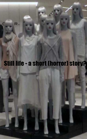 You are walking in a vast, shadowy room filled with mannequins. The mannequins are so life-like, that the only reason you believe they are mannequins is because they do not move at all. As you walk past rows and rows of these mannequins, listening to the soft patter of your feet, a mannequin standing few rows ahead blinks at you. A gasp escapes your mouth, and while you stand frozen to the spot, looking at the mannequin in the distance, trying to discern whether it really blinked at you or not, you hear faint scraping and scratching as a few mannequins turn towards you... the movement spreads through the rows like a ripple... a thousand eyes are now looking for you... you can feel the murderous intent behind those opaque eyes... the only way for you to avoid the scrutiny is to keep still. The plan seems to work, as the mannequins slowly turn back to their positions, but the feeling that you are being watched persists... you know that any further movement will put you in danger again. So now you are left standing in a row of mannequins, waiting for an unsuspecting human (like you) to come along, so that you could somehow catch their attention (by blinking, perhaps) and be saved...