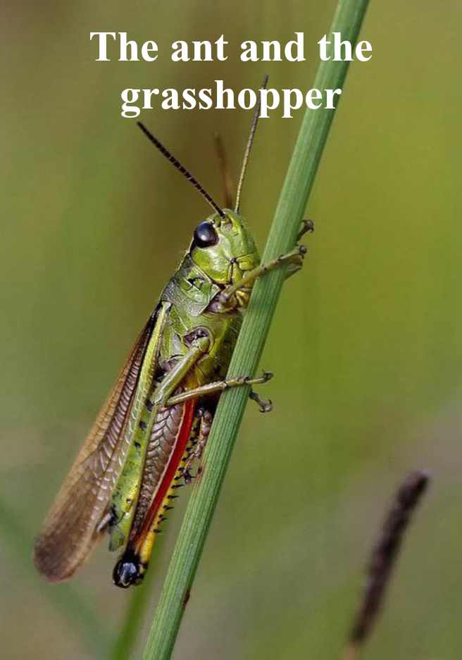 In a field one summer's day, a Grasshopper was hopping about, chirping and singing to its heart's content. An Ant passed by bearing along with great effort an ear of corn he was taking to the nest. "Why not come and chat with me, " Said the grasshopper, " instead of toiling and moiling away ?" "I am helping to lay up food for the winter, " Said the ant "and recommend you to do the same." " Why bother about winter ?" Said the grasshopper; we have got plenty of food at present.