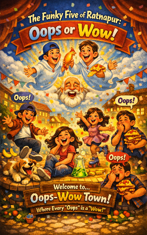 In the town of Ratnapur lived five unforgettable kids: Ravi the prankster, Meera the giggler, Kiran the soda‑scientist, Anaya the dancer, and Dev the foodie. Together they invented a game called “Oops or Wow!” — a game where every silly attempt was judged not by success or failure, but by how funny or surprising it turned out.