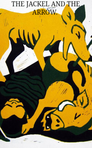 The Jackal decided first to lick the blood and eat a little flesh stuck round the tusks of the boar. But, as soon as, he put pointed tip of the Boar's tusks in his mouth it pierced his jaws and went through his head. The Jackal died on the spot.