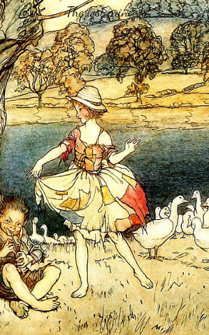 She liked her lips upon spotting the delicious apples. But she didn't know how to climb the tree. So she started crying. A woodcutter from the nearby village spotted her and after enquiring about her, he climbed the tree and plucked the apples and gave it to her on the condition that she should work for him. She agreed and received the apples, feasting on them with joy. After she ate, the woodcutter took her to a thatched house and asked her to clean it. She cleaned the house with difficulty and rested afterward. The woodcutter also taught her to cook, wash, and iron clothes. She passed a year under his supervision. After she finished the chores, she went with him to the forest to help him and learned to plant crops for food and weave clothes from yarn. After some days the woodcutter took her to a palace where she had to work as a cook. She was busy with cooking and washing utensils for about a year. One day there was a ball in the palace, and she was asked to get ready and join everyone at the ball. The woodcutter came to her wearing the most fabulous dress befitting a king. He also gave her a beautiful blue gown embroidered with golden thread. She wore it and attended the ball where she discovered that the woodcutter was the prince of the kingdom. She thanked him profusely and he proposed to her. She accepted his proposal, married him, and lived happily ever after.