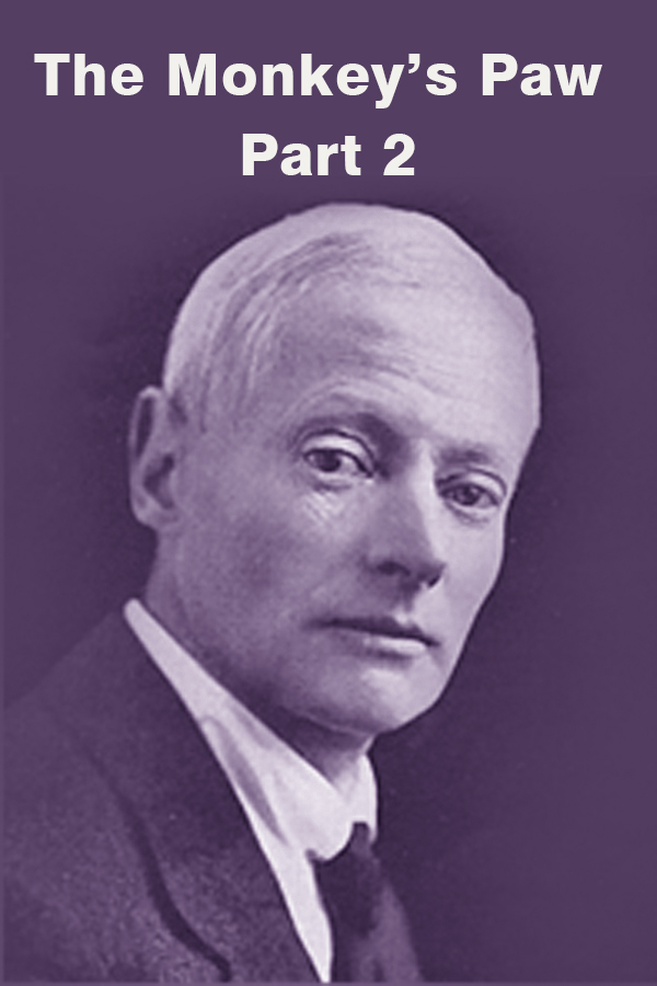 "Never mind, though; there's no harm done, but it gave me a shock all the same." They sat down by the fire again while the two men finished their pipes. Outside, the wind was higher than ever, an the old man started nervously at the sound of a door banging upstairs. A silence unusual and depressing settled on all three, which lasted until the old couple rose to retire for the rest of the night. "I expect you'll find the cash tied up in a big bag in the middle of your bed," said Herbert, as he bade them good night, " and something horrible squatting on top of your wardrobe watching you as you pocket your ill gotten gains." He sat alone in the darkness, gazing at the dying fire, and seeing faces in it. The last was so horrible and so simian that he gazed at it in amazement. It got so vivid that, with a little uneasy laugh, he felt on the table for a glass containing a little water to throw over it. His hand grasped the monkey's paw, and with a little shiver he wiped his hand on his coat and went up to bed. Part II In the brightness of the wintry sun next morning as it streamed over the breakfast table he laughed at his fears. There was an air of prosaic wholesomeness about the room which it had lacked on the previous night, and the dirty, shrivelled little paw was pitched on the side-board with a carelessness which betokened no great belief in its virtues. "I suppose all old soldiers are the same," said Mrs White. "The idea of our listening to such nonsense! How could wishes be granted in these days? And if they could, how could two hundred pounds hurt you, father?" "Might drop on his head from the sky," said the frivolous Herbert. "Morris said the things happened so naturally," said his father, "that you might if you so wished attribute it to coincidence."