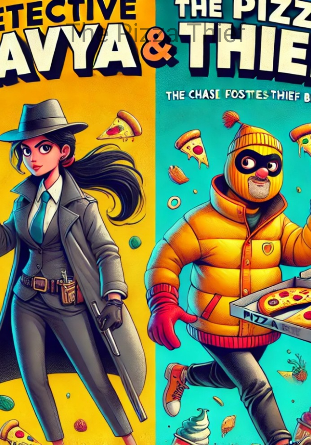 The next day, Ragini Ahuja and Sid Ahuja were having double cheese pizza at their bungalow. They were celebrating their recent financial success in their business. They had already hosted a success party for their colleagues a few days ago, and today, they decided to celebrate by having double cheese pizza. Suddenly, The Pizza Thief broke the window and entered their bungalow. Ragini and Sid were shocked. He said, "No more pain, no more grief, there will be only relief. You can call me 'The Pizza Thief.'" Ragini and Sid were shocked. The Pizza Thief attacked them. He punched Sid in the face hard and pushed Ragini. He grabbed the juice glass from the table and splashed it in Ragini's face. Sid was about to catch him, but The Pizza Thief suddenly banged a plate on his head. Sid grabbed his shirt and punched him hard in the face. The Pizza Thief laughed weirdly and said, "Nice punch!" He then slapped Sid five times, lifted him with his hands, and slammed him on the floor. Sid tried to get up, but The Pizza Thief put black pepper in his eyes, causing his eyes to burn. Ragini grabbed his shirt suddenly, he put black pepper in her eyes too, causing her eyes to burn. The Pizza Thief pushed them, and they both fell on the floor, injured and defeated. He grabbed the double cheese pizza and ate it hurriedly in a weird way, then escaped. Ragini and Sid washed their eyes and were shocked to see the condition of their house. The Pizza Thief had destroyed everything. They immediately went to Detective Kavya’s office and met her. They requested her to help them, but she refused because she was tired. Ragini offered her a precious gold jewelry set in exchange for catching the Pizza Thief. Detective Kavya instantly agreed to help them. She visited their house and started the investigation. She found a piece of yellow cloth stuck in the corner of the broken window. Ragini told her that The Pizza Thief had worn a yellow jacket and entered through the window, so the piece of cloth was likely torn from his jacket. Detective Kavya checked the piece of cloth carefully. She went to Aryan Basin, a fashion designer and cloth expert. Aryan checked the cloth material and told her that it appeared to be new and recently purchased. He said that there was only one company in the city that made yellow jackets, and that company was AS Jackets. Aryan gave her the contact number of Afzan Sheikh, the owner of AS Jackets. Kavya arranged a meeting with Afzan and met him. Afzan checked the piece of cloth, sniffed it, and said, "You’re right, Detective Kavya. This cloth was produced by my company." This brought a smile to her face. She told him that she wanted to know who had purchased this yellow jacket from him. Afzan checked the sales record on his computer and informed her that the yellow jacket was a new product recently released in the market. So far, it had been purchased by only two customers— Namita and Mr. Unknown. Detective Kavya was shocked. She thought " Namita" was a nice name and felt she couldn't be the thief, but the name "Mr. Unknown" seemed suspicious, so she suspected he must be the Pizza Thief. She took Mr. Unknown's contact number from Afzan. She traced the cellphone location of Mr. Unknown, which was near an alley on Street 17, a deserted area. She reached the location, and The Pizza Thief was sitting on a public bench eating a pizza. Detective Kavya confronted him, and The Pizza Thief was shocked. An intense fight broke out between them. After a lot of struggle, she overpowered him and handcuffed him. Finally, The Pizza Thief was caught. Detective Kavya was very close to her reward of gold jewelry, but then she changed her mind. She felt that if she caught The Pizza Thief for the gold jewelry, people might think she was greedy. So, she freed The Pizza Thief and allowed him to escape. The Pizza Thief ran as fast as he could and disappeared. Detective Kavya visited Ragini's house and told her that she was no longer interested in the gold jewelry set or in catching The Pizza Thief. Ragini and Sid offered her the most expensive jewelry set in the world in exchange for catching The Pizza Thief, but Detective Kavya refused. She had changed her mind and wasn't in the mood to catch him.