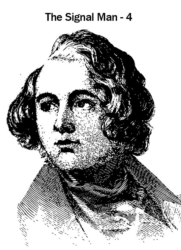 "One moonlight night," said the man, "I was sitting here, when I heard a voice cry, 'Halloa! Below there!' I started up, looked from that door, and saw this Some one else standing by the red light near the tunnel, waving as I just now showed you. The voice seemed hoarse with shouting, and it cried, 'Look out! Look out!' And then attain, 'Halloa! Below there! Look out!' I caught up my lamp, turned it on red, and ran towards the figure, calling, 'What's wrong? What has happened? Where?' It stood just outside the blackness of the tunnel. I advanced so close upon it that I wondered at its keeping the sleeve across its eyes. I ran right up at it, and had my hand stretched out to pull the sleeve away, when it was gone."