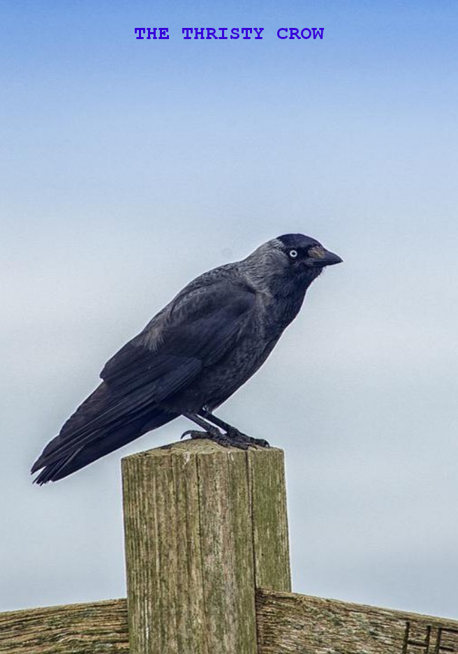 It was a hot summer's day. A thirsty crow flew into a village searching for some water to drink. He flew over houses, fields and trees but he could not find any water. After a long time, he came across a farm.