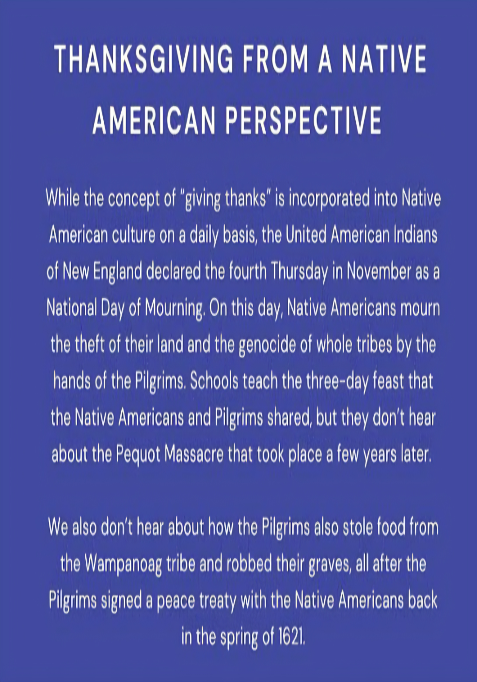 Growing up we honestly didn't learn much about what Thanksgiving actually meant. To us it was the settlers eating dinner with Native Americans, that's the picture they put in our school rooms, showed us. Everyone is happy and grateful. So for years I believed that, until that day when you learn the truth.