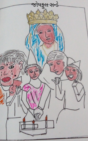 તેણે જોયું કે દેવળના પ્રવેશદ્વારેથી નાની બાળાઓ પ્રાર્થના નૃત્ય કરતી કરતી દેવળના આગળના ભાગે આવી રહી હતી. કેટલીક મહિલાઓ પણ સજીધજીને ; પોતાના માથા ઉપર ઘડા-બેડાં મૂકીને બાળાઓની પાછળ પાછળ ચાલી રહી હતી. અમુક યુવાનો અને કિશોરો પોતાના સ્માર્ટ ફોન થકી આ નયનરમ્ય દ્રશ્યને કેમેરામાં કંડારી રહ્યા હતા. ભોયતળીએ બેઠેલા તમામ ભક્તજનો સ્હેજ વાંકા વળીને નૃત્ય કરતી બાળાઓને જોઇ રહ્યા હતા. મધર મેરીની પ્રતિમાને દેવળમા લાવવામાં આવી. અને એક ઠેકાણે મૂકવામાં આવી. તેણે જોયું કે પ્રતિમાને સરસ રીતે શણગારવામાં આવી હતી. મધર મેરીને નવી નક્કોર સાડી પહેરાવવામાં આવી હતી જોકે તે સાડીનો રંગ ઓળખવા ગયો પણ ન ખબર પડી. તેને વિચાર આવ્યો કે પોતે જો પોતાનો સ્માર્ટફોન લાવ્યો હોત તો પ્રતિમાનો ફોટો પાડી લેત અને એ પછી રંગના જાણકારને તે બતાવીને જે તે રંગ કયો છે તે જાણી લેત. તેણે ઓબ્ઝર્વ કર્યું કે બાળાઓએ પહેરેલી ફ્રોકનો રંગ ગુલાબી અને સફેદ હતો. તેણે બધી બાળાઓના ચહેરા પર ફુલ મેક અપ કરેલો જોયો.