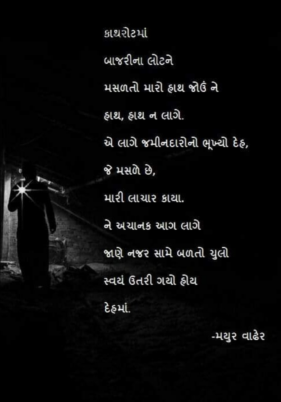 ઓરડીમાં ઉભર્યો પણ લીસોટો ઉજળે દેહ, નળિયું ખસ્યું કે હેં ખસી દાનત છે આ ઘરની? ના, ભીંત ખુલી ભળાય આ તો ... ઓરડીમાં ઉભર્યો પણ લીસોટો ઉજળે દેહ, નળિયું ખસ્યું કે હેં ખસી દાનત છે આ ઘરની? ના, ...