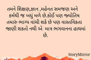 તમને શિક્ષણ,જ્ઞાન ,મહેનત સમજણ અને કર્મથી જ બધું મળે છે.કોઈ પણ જ્યોતિષ તમારું ભાગ્ય વાંચી શકે છે પણ વાસ્તવિકતા જાણી શકતો નથી એ માત્ર ભગવાનના હાથમાં છે.