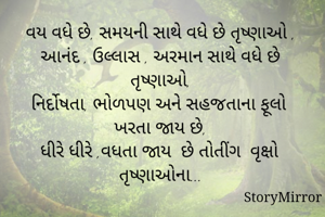 વય વધે છે, સમયની સાથે વધે છે તૃષ્ણાઓ , આનંદ , ઉલ્લાસ , અરમાન સાથે વધે છે તૃષ્ણાઓ, નિર્દોષતા, ભોળપણ અને સહજતાના ફૂલો ખરતા જાય છે, ધીરે ધીરે ,વધતા જાય છે તોતીંગ વૃક્ષો તૃષ્ણાઓના...