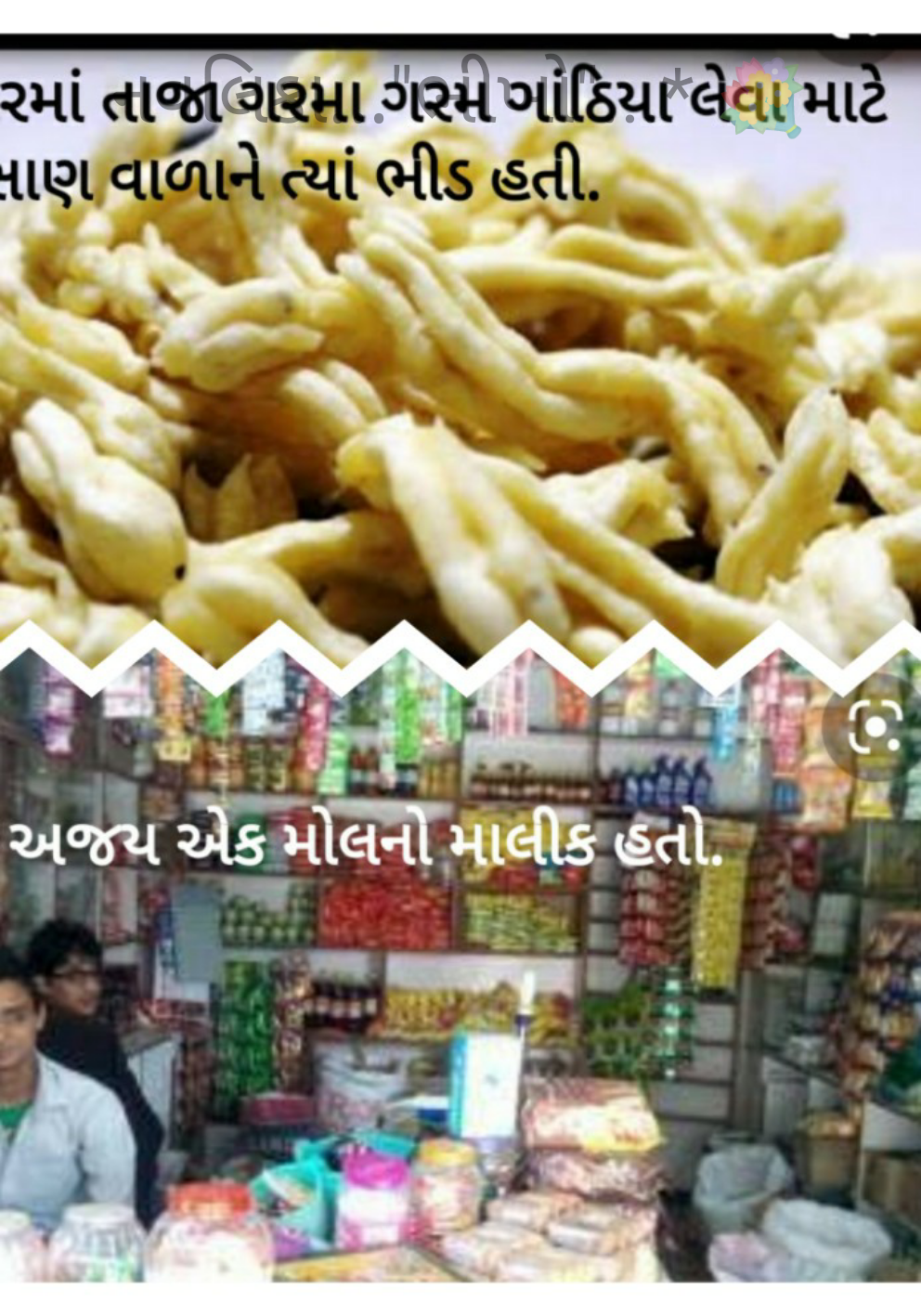 સવારમાં તાજા ગરમા ગરમ ગાંઠિયા લેવા માટે ફરસાણવાળાને ત્યાં ભીડ હતી. અને આ જે કહેવામાં આવ્યું હતું તે ભીખાને ઉદેશીને કહેવામાં આવ્યું હતું. ભીખો ભિખારી નહોતો પણ સંજોગો એ તેના આવા હાલ કરી મુક્યા હતા. સવારે કોઈને રામ વસે અને પચાસ ગ્રામ ગાંઠિયા જો ભીખાને મળી જાય તો તે બીજા દિવસની સવાર સુધી ખેંચી નાખતો. પણ હમણાં ત્રણ દિવસથી ભીખાનાં રામ પણ રિસાણા હોય તેમ ત્રણ દિ' થી મોમાં અન્નનો દાણો નહોતો ગયો એટલે આજે ભીખામાં ભૂખથી થોડી તલપાપડ વધારે હતી.