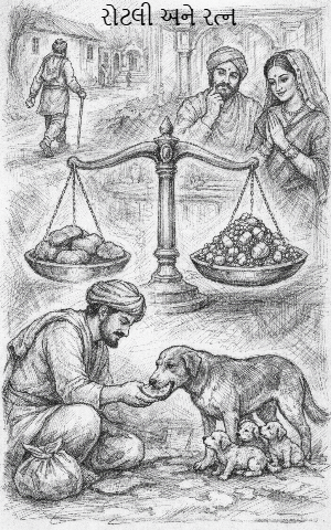 ધનપતિ તૈયાર થયા. સેઠે કહ્યું, “આ પુણ્યના બદલામાં હું તમને ચાર રોટલીના વજન જેટલા હીરા-મોતી આપીશ.” ચાર રોટલીઓ તોલીને તરાજૂના એક ત્રાજવા માં મૂકવામાં આવી. બીજા ત્રાજવામાં હીરા-જવાહેરાતોની પોટલી મૂકી. ત્રાજવું હલ્યું નહીં. બીજી પોટલી, ત્રીજી… અનેક પોટલીઓ મૂકવા છતાં ત્રાજવું હલ્યું નહીં.
