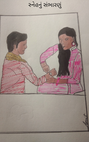 એ ચાલી ગઈ પછી તેણે રાખડીનુ નિરીક્ષણ કર્યું. તેણે જોયું કે સુંદર રાખડી હતી. સોનેરી રંગના મણકા અને વચ્ચે હાથી. હાથીના શરીર પર નાના નાના ડાયમંડ. બે નાના રૂદ્રાક્ષ પણ તેમાં જડેલા હતા.