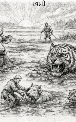 આ વાર્તા માત્ર ગાય અને વાઘની નથી, આ તો આપણા અંતરની વાત છે. જ્યાં સુધી અહંકાર કહે છે “હું પૂર્ણ છું”, ત્યાં સુધી કીચડ વધુ ઊંડો થતો જાય છે. પણ જ્યારે હૃદય કહે છે “મારે માર્ગદર્શક જોઈએ છે”, ત્યારે પ્રકાશની કિરણ આવે છે, હાથ આગળ વધે છે અને જીવન ફરી ઊભું થાય છે.