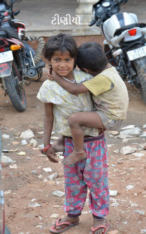 ડોશીએ ફરીથી આજીજી કરી, ‘બેટા, કોક ઓય તો આલો ભા. બઉ ભૂખી શુ.’ ડોશીને કાકલુદી કરતા જોઈ ટીણીયાનું મન તરત જ પીગળી ગયું. કાંઈ પણ વિચાર્યા વગર એણે પોતાની ડીશ એમ ને એમ ડોશીના હાથમાં મૂકી દીધી. રજુજી અને એના ભાઈ-બહેન તો જોતા જ રહી ગયા. ડોશી તો ટીણીયાને બોલાવીને કશુંય કહ્યા વગર માથે હાથ મૂકીને ચાલતા થયા અને ટીણીયાની આંખમાં પાણી ભરાઈ આવ્યા.