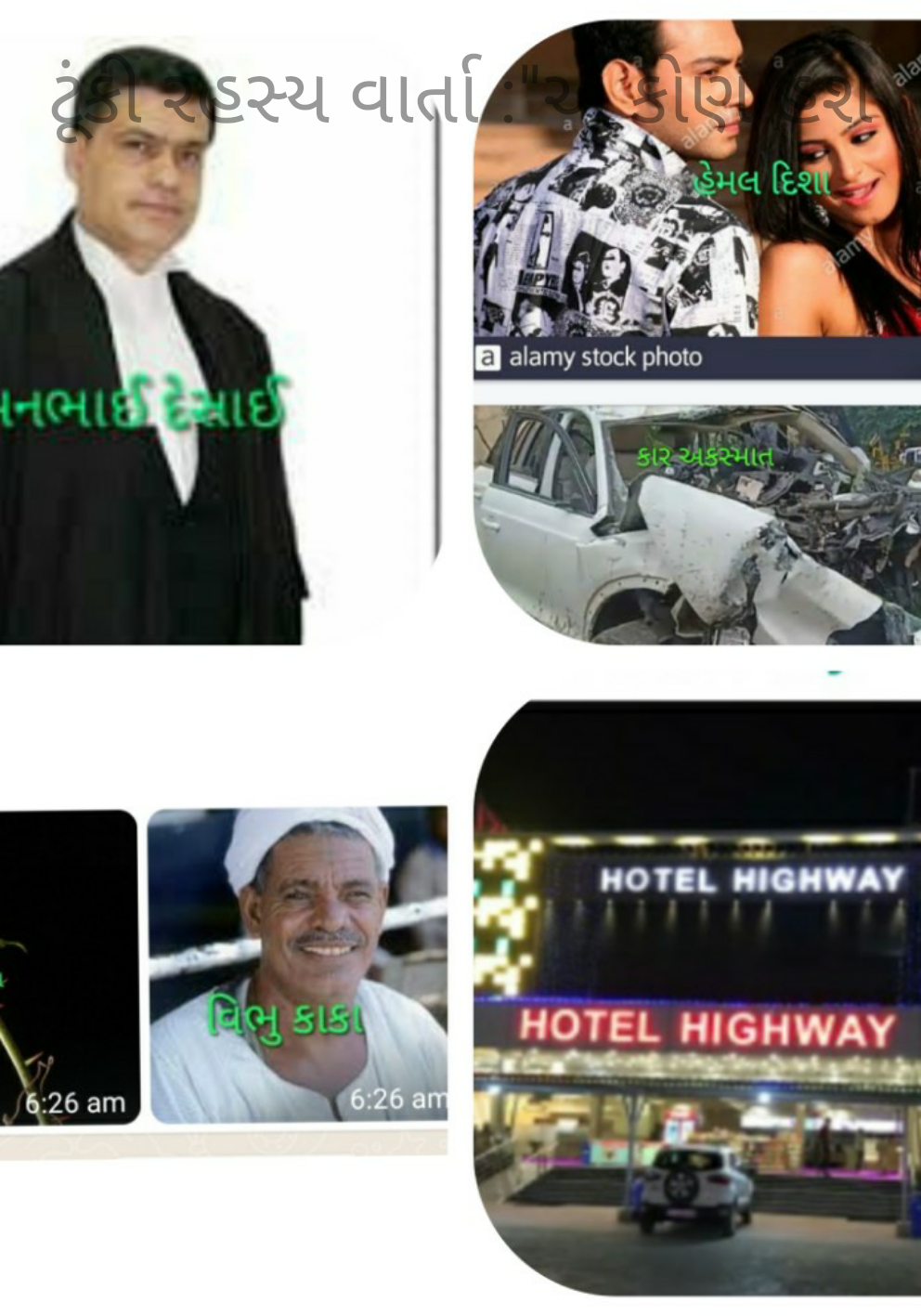 "મને આપેલ કવર દેસાઈ સાહેબ પેક કરવું ભૂલી ગયા હતા. મેં કુતુહલ વસ ખોલીને જોયું તો તેમાં રફ કાગળો હતા. એક પણ કાગળ કામનો નહોતો. હું સમજી ગયો કે કોઈક સાઝીશ આકાર લઈ રહી છે. હું કાર ડ્રાઈવ કરી જઈ રહ્યો હતો. જ્યારથી હું અહીંથી નીકળ્યો ત્યારથી એક કાળી કાર મારો પીછો કરી રહી હતી. મારી શંકા સાચી પડી કે રસ્તામાં મારુ ખૂન કરવાની યોજના છે. હું હાઈ વે હોટલ ઉપર ઉભો રહ્યો, કાળી કાર આગળની હોટલ પાસે ઉભી રહી. હવે મને ચોક્કસ ખાતરી થઈ ગઈ કે આ લોકો મારો પીછો કરે છે. મેં હોટલની બાજુનાં પેટ્રોલ પમ્પ ઉપરથી વીસ લિટરનો પેટ્રોલ ભરેલા કેરબો લઈ લીધો અને આગળની સફર શરૂ કરી."
