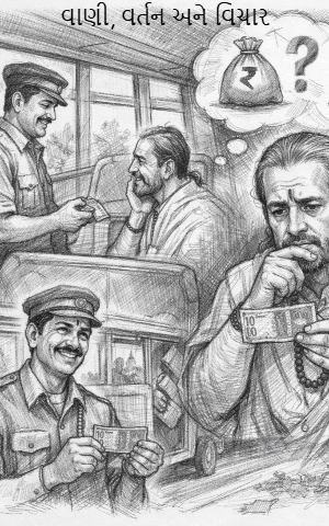 મનમાં તરત જ વિચારનું તોફાન ઊઠ્યું – “થોડી વાર પછી પરત આપી દઈશ.” પરંતુ પળભરમાં લોભનો કાળો કીડો હૃદયમાં કાટવા લાગ્યો. “આ તો માત્ર દસ રૂપિયા છે, બસ કંપની લાખોની કમાણી કરે છે. આને ભગવાનની અણધારી ભેટ સમજીને રાખી લઉં તો શું ખોટું?” આ વિચારો વચ્ચે તેમના મનમાં સંસ્કૃત શ્લોક સ્ફૂર્યો: