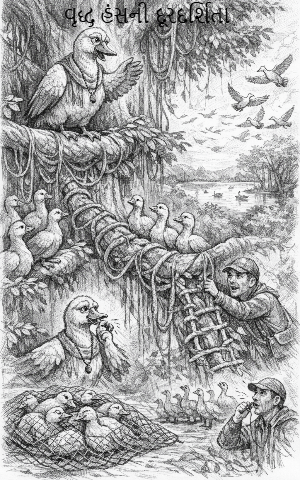 ત્યારે દાદાએ કહ્યું: “સાંભળો. સવારે જ્યારે બહેલિયો આવશે ત્યારે મૃત્યુનો નાટક કરો. તે તમને મૃત સમજીને જાળમાંથી કાઢીને જમીન પર મૂકશે. ત્યાં પણ મૃત જેવા આંખો બંધ કરી પડ્યા રહો. જેવો છેલ્લો આપનો હંસ ભાઈ નીચે મૂકે કે તરત જ હું સીટી વગાડીશ. સીટીની સાથે જ બધા ઊડી જાજો.”