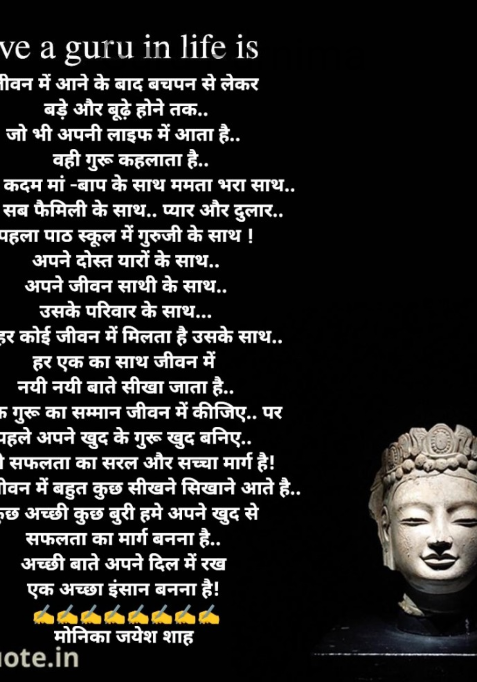 बेशक गुरू का सम्मान जीवन में कीजिए.. पर पहले अपने खुद के गुरू खुद बनिए.. वही सफलता का सरल और सच्चा मार्ग है! लोग जीवन में बहुत कुछ सीखने सिखाने आते है.. कुछ अच्छी कुछ बुरी हमे अपने खुद से सफलता का मार्ग बनना है.. अच्छी बाते अपने दिल में रख एक अच्छा इंसान बनना है!