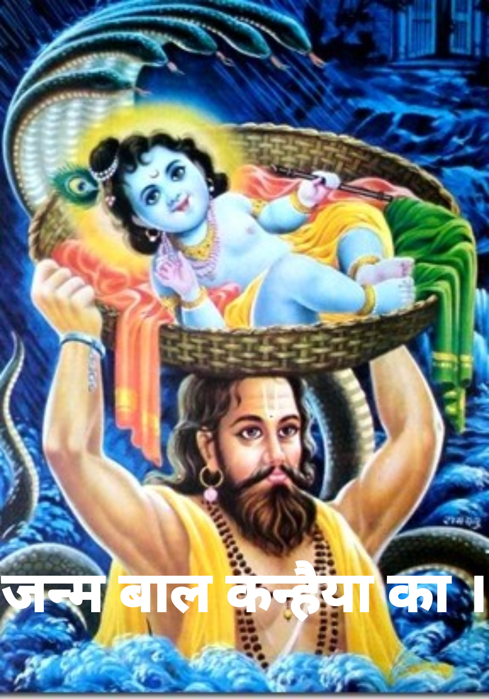 तब चले पिता वासुदेव लेकर अपने नवजात शिशु को रख कर अपने सिर पर जहां किया इंद्र देव ने अपने बारिश की करके वर्षा उनका चरण स्पर्श और माता यमुना ने उछाल कर उनके चरण स्पर्श लेने प्रभु की आशीर्वाद और फिर करने वर्षा से प्रभु की रक्षा आए शेष नाग जो ले चुके थे पहले से गोकुल में जन्म बन कर कन्हैया के बड़े भैय्या ।