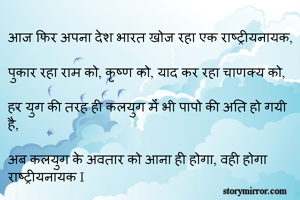 आज फिर अपना देश भारत खोज रहा एक राष्ट्रीयनायक, पुकार रहा राम को, कृष्ण को, याद कर रहा चाणक्य को, हर युग की तरह ही कलयुग में भी पापो की अति हो गयी है, अब कलयुग के अवतार को आना ही होगा, वही होगा राष्ट्रीयनायक I