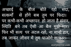 अच्छाई के बीज बोते रहो सदा, सत्कर्मों से होंगे सब तुम पर फिदा। पर कभी-कभी अच्छापन हो जाता है संवार, स्थिति बने तब ऐसी आ बैल मुझे मार। फिर भी सत्य पर अटल रहो, ना मानो हार, तब जाकर जीवन में तुम पाओगे सत्कार।