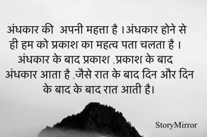 अंधकार की अपनी महत्ता है ।अंधकार होने से ही हम को प्रकाश का महत्व पता चलता है । अंधकार के बाद प्रकाश ,प्रकाश के बाद अंधकार आता है ;जैसे रात के बाद दिन और दिन के बाद के बाद रात आती है।