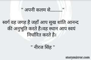 स्वर्ग वह जगह है जहाँ आप सुख शांति आनन्द की अनुभूति करते है।वह स्थान आप स्वयं निर्धारित करते है।