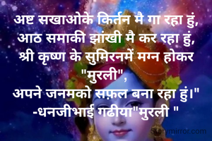 अष्ट सखाओके किर्तन मै गा रहा हुं, आठ समाकी झांखी मै कर रहा हुं, श्री कृष्ण के सुमिरनमें मग्न होकर "मुरली", अपने जनमको सफ़ल बना रहा हुं।" -धनजीभाई गढीया"मुरली "