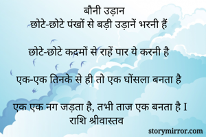 बौनी उड़ान छोटे-छोटे पंखों से बड़ी उड़ानें भरनी हैं छोटे-छोटे कदमों से राहें पार ये करनी है एक-एक तिनके से ही तो एक घोंसला बनता है एक एक नग जड़ता है, तभी ताज एक बनता है I राशि श्रीवास्तव