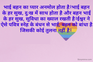 भाई बहन का प्यार अनमोल होता है।भाई बहन के हर सुख, दुःख में साथ होता है और बहन भाई के हर सुख, सुविधा का ख्याल रखती है।ईश्वर ने ऐसे पवित्र स्नेह के बंधन से भाई, बहन को बांधा है जिसकी कोई तुलना नहीं है।