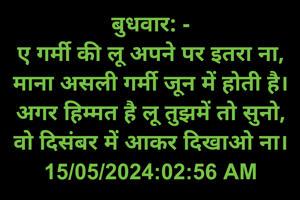 बुधवार: - ए गर्मी की लू अपने पर इतरा ना, माना असली गर्मी जून में होती है। अगर हिम्मत है लू तुझमें तो सुनो, वो दिसंबर में आकर दिखाओ ना। 15/05/2024:02:56 AM