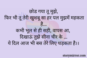 छोड गया तू मुझे, फिर भी तू तेरी खुशबू सा हर पल मुझमें महकता है... कभी भूल से ही सही, वापस आ, दिखाऊं तुझे सीना चीर के ... ये दिल आज भी बस तेरे लिए धड़कता है।।