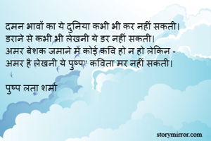दमन भावों का ये दुनिया कभी भी कर नहीं सकती। डराने से कभी भी लेखनी ये डर नहीं सकती। अमर बेशक जमाने में कोई कवि हो न हो लेकिन - अमर है लेखनी ये पुष्प" कविता मर नहीं सकती। पुष्प लता शर्मा