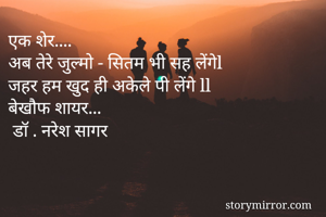 एक शेर.... अब तेरे जुल्मो - सितम भी सह लेंगेl जहर हम खुद ही अकेले पी लेंगे ll बेखौफ शायर... डॉ . नरेश सागर