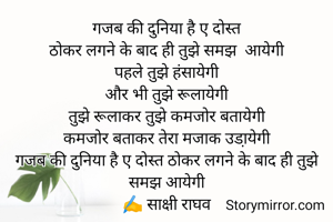 गजब की दुनिया है ए दोस्त ठोकर लगने के बाद ही तुझे समझ आयेगी पहले तुझे हंसायेगी और भी तुझे रूलायेगी तुझे रूलाकर तुझे कमजोर बतायेगी कमजोर बताकर तेरा मजाक उडा़येगी गजब की दुनिया है ए दोस्त ठोकर लगने के बाद ही तुझे समझ आयेगी ✍️ साक्षी राघव