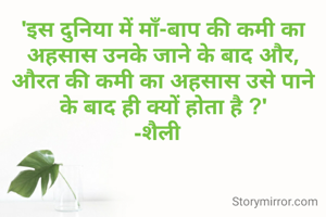 'इस दुनिया में माँ-बाप की कमी का अहसास उनके जाने के बाद और, औरत की कमी का अहसास उसे पाने के बाद ही क्यों होता है ?' -शैली