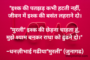 "इश्क की पतझड़ कभी हटती नहीं, जीवन में इश्क की बसंत लहराने दो। "मुरली" इश्क की छेड़ना चाहता हूं, मुझे श्याम बनकर राधा को ढुंढने दो।" -धनज़ीभाई गढीया"मुरली" (ज़ुनागढ)