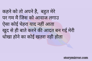 कहने को तो अपने है, बहुत मेरे पर गम मै जिस को आवाज लगाउ ऐसा कोई चेहरा याद नहीं आता खुद से ही बाते करने की आदत बन गई मेरी धोखा होने का कोई खतरा नही होता
