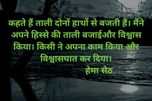 कहते हैं ताली दोनों हाथों से बजती है। मैंने अपने हिस्से की ताली बजाईऔर विश्वास किया। किसी ने अपना काम किया और विश्वासघात कर दिया।