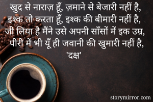 खुद से नाराज़ हूँ, ज़माने से बेजारी नहीं है, इश्क तो करता हूँ, इश्क की बीमारी नहीं है, जी लिया है मैंने उसे अपनी साँसों में इक उम्र, पीरी में भी यूँ ही जवानी की खुमारी नहीं है, 'दक्ष'