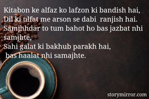 Kitabon ke alfaz ko lafzon ki bandish hai, Dil ki ulfat me arson se dabi ranjish hai. Samjhhdar to tum bahot ho bas jazbat nhi samjhte, Sahi galat ki bakhub parakh hai, bas haalat nhi samajhte.