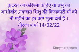 कुदरत का करिश्मा कहिए या प्रभु का आशीर्वाद ,नवजात शिशु की किलकारी माँ को नौ महीने का हर कष्ट भुला देती है । नीरजा शर्मा 14/02/22