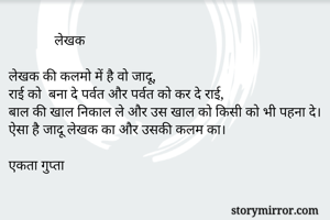 लेखक लेखक की कलमो में है वो जादू, राई को बना दे पर्वत और पर्वत को कर दे राई, बाल की खाल निकाल ले और उस खाल को किसी को भी पहना दे। ऐसा है जादू लेखक का और उसकी कलम का। एकता गुप्ता
