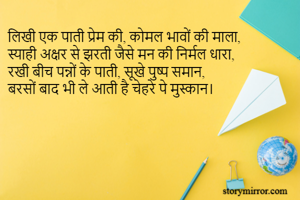 लिखी एक पाती प्रेम की, कोमल भावों की माला, स्याही अक्षर से झरती जैसे मन की निर्मल धारा, रखी बीच पन्नों के पाती, सूखे पुष्प समान, बरसों बाद भी ले आती है चेहरे पे मुस्कान।